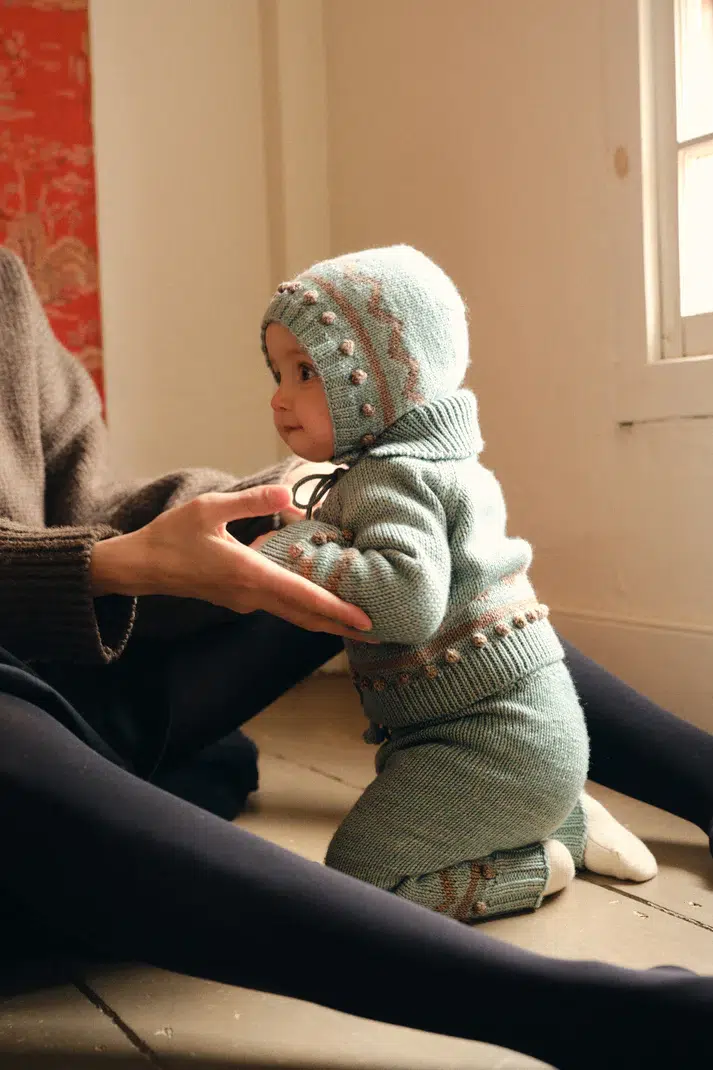 Misha & Puff Baby Zig Zag Bonnet Sage is an adorable hand-knit bonnet hood in Merino wool.