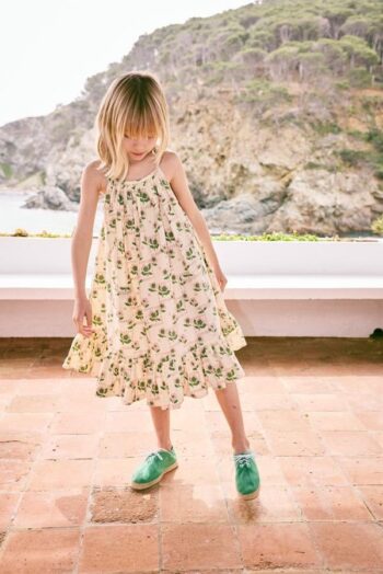 Karina dress featured hand-embroidered trim along the straps and neckline, plus a ruffled hem — designed to grow with them.