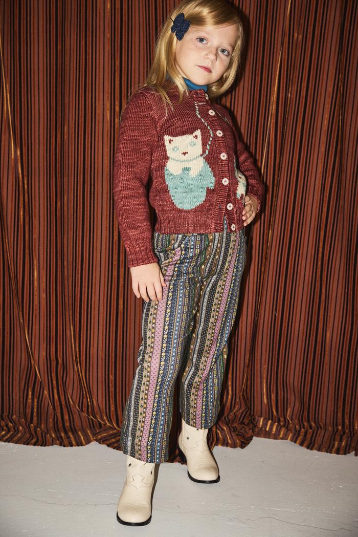The cosy cardigan features a kitten motif intarsia with hand-worked popcorn stitch detail, ribbed trim, and corozo button closure.
